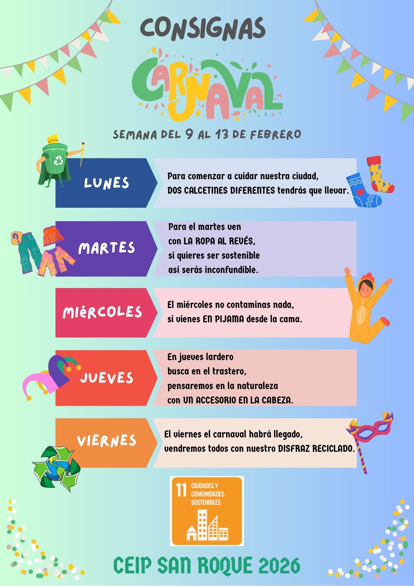 Comenzamos nuestra semana con las consignas diarias que nos animan a venir al cole con ganas de celebrar el Carnaval.